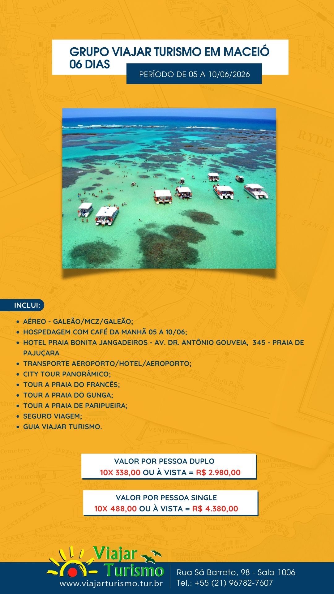 GRUPO VIAJAR TURISMO EM MACEIÓ 06 DIAS 24/02/202604/08/2025 Por Viajar Turismo LTDA GRUPO VIAJAR TURISMO EM MACEIÓ 06 DIAS Período DE 05 A 10/06/2026 Inclui: AÉREO – GALEÃO/MCZ/GALEÃO;HOSPEDAGEM COM CAFÉ DA MANHÃ 05 A 10/06;HOTEL PRAIA BONITA JANGADEIROS – AV. DR. ANTÔNIO GOUVEIA, 345 – PRAIA DE PAJUÇARATRANSPORTE AEROPORTO/HOTEL/AEROPORTO;CITY TOUR PANORÂMICO;TOUR A PRAIA DO FRANCÊS;TOUR A PRAIA DO GUNGA;TOUR A PRAIA DE PARIPUEIRA;SEGURO VIAGEM;GUIA VIAJAR TURISMO. Preço por pessoa: VALOR POR PESSOA DUPLO10X 338,00 OU À VISTA = R$ 2.980,00VALOR POR PESSOA single10X 488,00 OU À VISTA = R$ 4.380,00 Post Views: 323