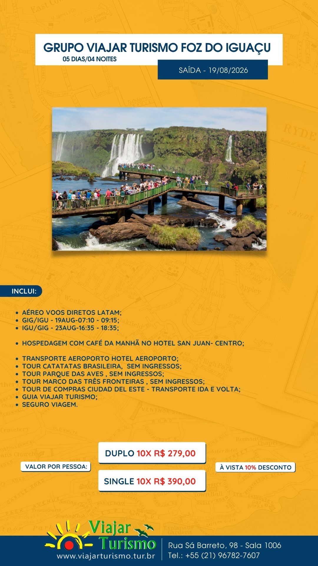 GRUPO VIAJAR TURISMO FOZ DO IGUAÇU – SAÍDA – 19/08/2026 23/11/202522/11/2025 Por Viajar Turismo LTDA GRUPO VIAJAR TURISMO FOZ DO IGUAÇU SAÍDA - 19/08/2026 Inclui: AÉREO VOOS DIRETOS LATAM;GIG/IGU – 19AUG-07:10 – 09:15;IGU/GIG – 23AUG-16:35 – 18:35;Hospedagem com café da manhã no hotel SAN JUAN- CENTRO;TRANSPORTE AEROPORTO HOTEL AEROPORTO;TOUR CATATATAS BRASILEIRA, SEM INGRESSOS;TOUR PARQUE DAS AVES , SEM INGRESSOS;TOUR MARCO DAS TRÊS FRONTEIRAS , SEM INGRESSOS;TOUR DE COMPRAS CIUDAD DEL ESTE – TRANSPORTE IDA E VOLTA;GUIA VIAJAR TURISMO;SEGURO VIAGEM. Preço por pessoa: VALOR à VISTA Duplo 10x R$ 279,00VALOR à VISTA single 10x R$ 390,00À VISTA 10% DESCONTO Post Views: 209
