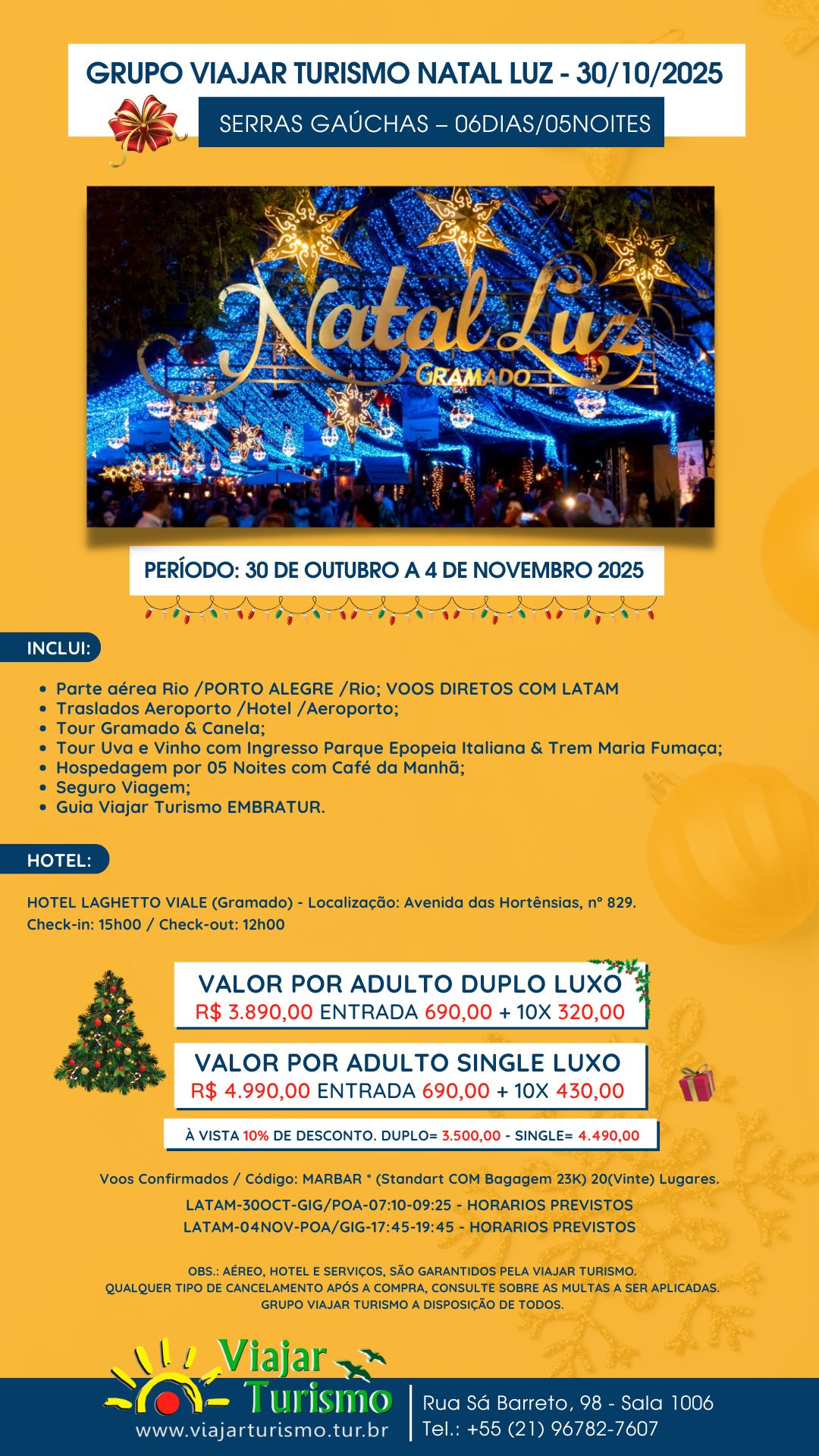 GRUPO VIAJAR TURISMO NATAL LUZ – 30/10/2025 07/07/202525/02/2025 Por Viajar Turismo LTDA GRUPO VIAJAR TURISMO NATAL LUZ - 30/10/2025 SERRAS GAÚCHAS – 06DIAS/05NOITES Inclui: Parte aérea Rio /PORTO ALEGRE /Rio; VOOS DIRETOS COM LATAMTraslados Aeroporto /Hotel /Aeroporto;Tour Gramado & Canela;Tour Uva e Vinho com Ingresso Parque Epopeia Italiana & Trem Maria Fumaça;Hospedagem por 05 Noites com Café da Manhã;Seguro Viagem;Guia Viajar Turismo EMBRATUR.HOTEL LAGHETTO VIALE (Gramado) – Localização: Avenida das Hortênsias, nº 829.Check-in: 15h00 / Check-out: 12h00 Preço por pessoa: VALOR POR ADULTO DUPLO LUXOR$ 3.890,00 ENTRADA 690,00 + 10X 320,00VALOR POR ADULTO SINGLE LUXOR$ 4.990,00 ENTRADA 690,00 + 10X 430,00 Voos Voos Confirmados / Código: MARBAR * (Standart COM Bagagem 23K) 20(Vinte) Lugares.LATAM-30OCT-GIG/POA-07:10-09:25 – HORARIOS PREVISTOSLATAM-04NOV-POA/GIG-17:45-19:45 – HORARIOS PREVISTOS OBS.: AÉREO, HOTEL E SERVIÇOS, SÃO GARANTIDOS PELA VIAJAR TURISMO.QUALQUER TIPO DE CANCELAMENTO APÓS A COMPRA, CONSULTE SOBRE AS MULTAS A SER APLICADAS.GRUPO VIAJAR TURISMO A DISPOSIÇÃO DE TODOS. Post Views: 314